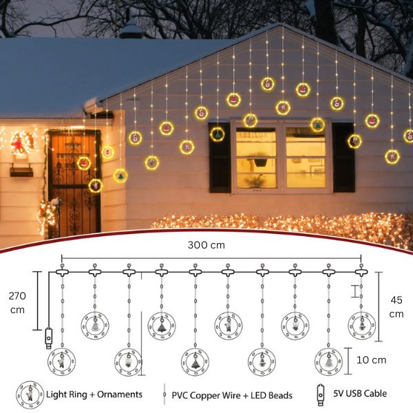 Az átlátszó gyűrűkben gondosan elhelyezett, finom csillogó fények varázslatos hangulatot teremtenek, miközben ragyogó fényt vetnek a felfüggesztett figurákra.