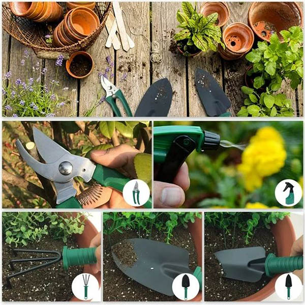 1 x Kerti szerszámkészlet tárolódobozzal: 1 x gyomlálókarom/ gereblye, 2 x ültetőkanál, 1 x metszőolló, 1 x porlasztó.